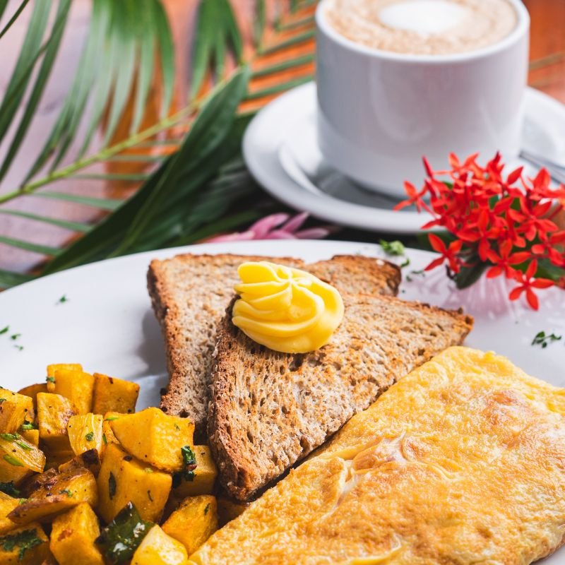 Mornings at El Patio set the tone for the day. Fresh coffee roasted in Costa Rica anchors the experience, paired with breakfast dishes that balance comfort and freshness.